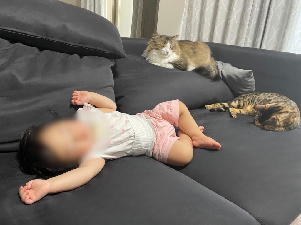 長女は3歳になりましたが、休日は一緒にソファでお昼寝できるほどの余裕があります。